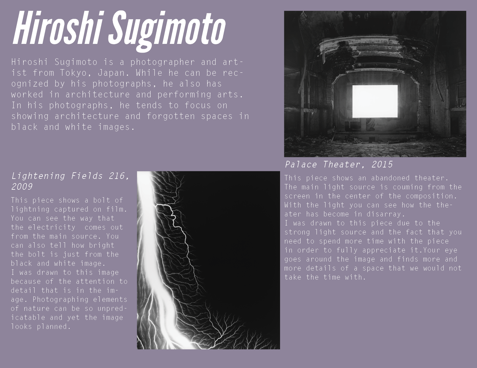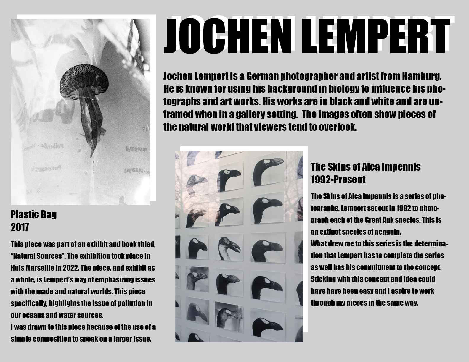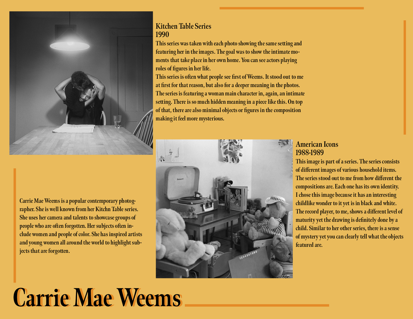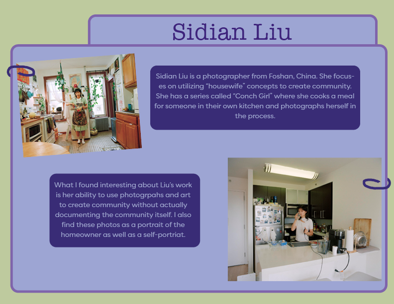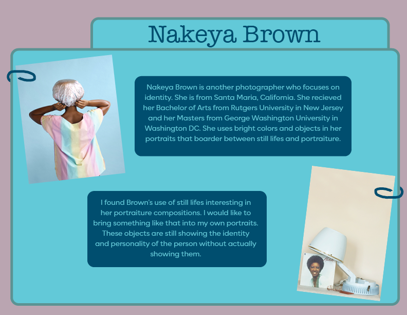 In Digital Photography, there were two separate assignments that touched on researching photographers. The first was more general for just contemporary artists. The second, was more specific for artists focusing in self portraits. Below are the designed pages featuring my research.